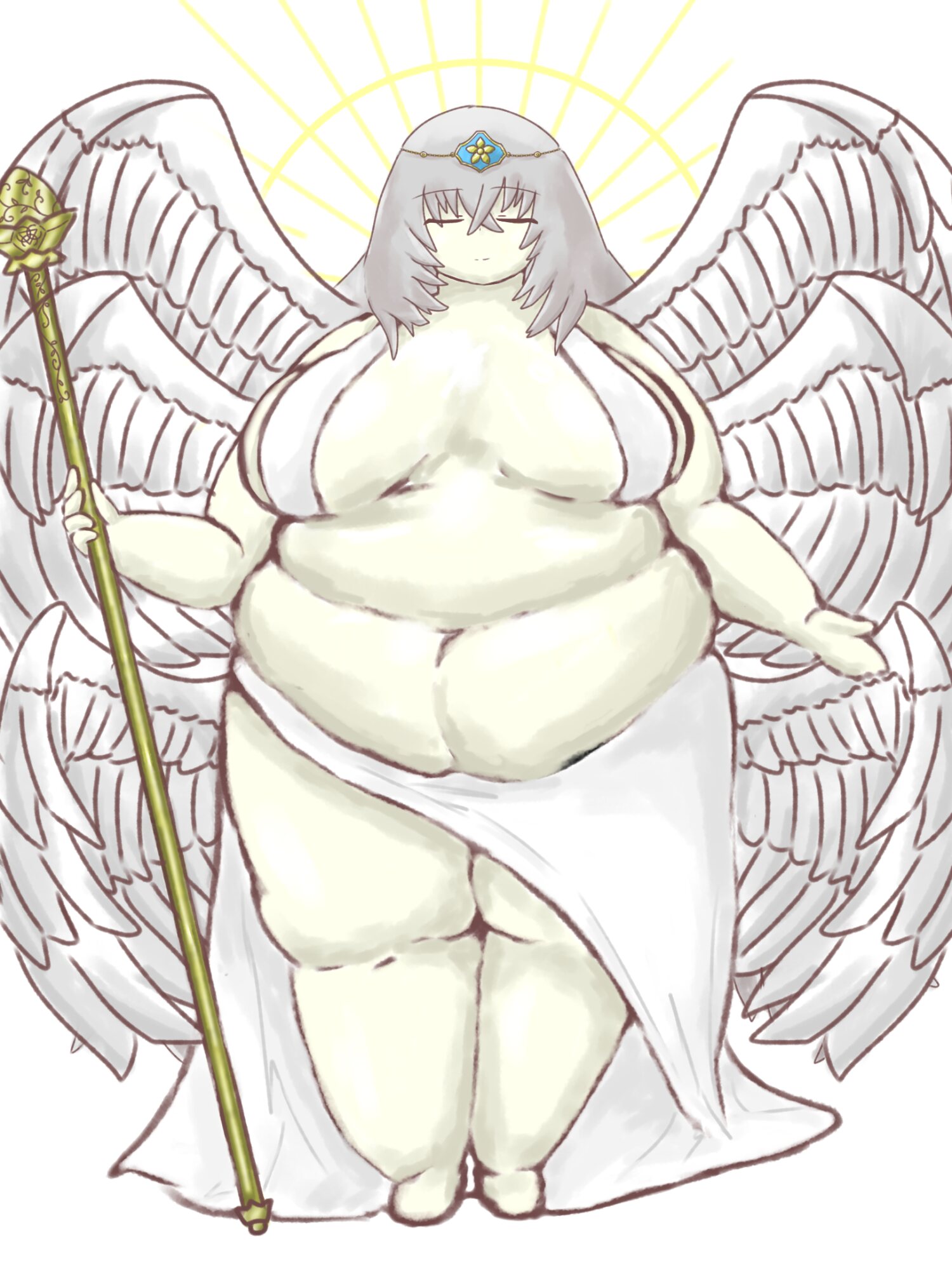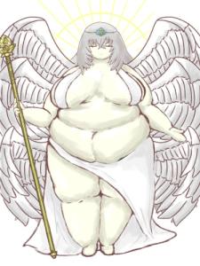 6対の翼に慈愛の笑みを浮かべた白い布一枚の女神みたいな描かれ方するんだけど裸婦像のように露出度が高く、大事なところだけはなんとか隠せてる爆乳にムチムチと太い二の腕にぶっとい太もも、そしてぽっちゃりと弛んだ2段腹に描かれていて見たサクラコ様本人が