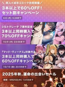 『マッド・ヴィーナス』対象作品3本以上同時購入で60%OFFキャンペーン!特設ページ: 同人誌・同人ゲーム・同人ボイス・ASMRのダウンロードなら「DLsite 同人 - R18」「DLsite ゲーム総合特設 - R18」はエロゲー・美少女ゲーム・同人ゲームのダウンロードショップ。お気に入りの作品をすぐダウンロードできてすぐ楽しめる!毎日更新しているのであなたが探している作品にきっと出会えます。国内最大級の二次元総合ダウンロードショップ「DLsite」! - トップページwww.dlsite.com\ 同人×成年コミック合同開催/ 3本以上で60%OFF!セット割キャンペーン特設ページ: 同人誌・同人ゲーム・同人ボイス・ASMRのダウンロードなら「DLsite 同人 - R18」\ 同人×成年コミック合同開催/ 3本以上で60%OFF!セット割キャンペーン開催中! ~9/25 13:59www.dlsite.com - 6二次元好きの匿名さん25/09/19(金) 00:04:43
