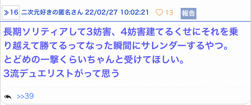 でもネット系はコミュニケーション要素皆無だし、トドメ刺すまで時間かかるデッキも多いからサレンダーは助かるわ - 186二次元好きの匿名さん22/04/24(日) 18:24:41