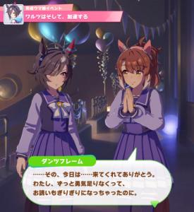 中々勝ちきれなくて沈んでいたダンツと黙々とトレーニングをするビリーヴ。マイペースなビリーヴだからこそダンツに気負わせないことができるとは…これのリハクの目を持ってしても、見破れませんでした。惜しくもURA賞受賞を逃したビリーヴを讃えさせるためにドロワのダンスに誘ったのは素晴らしいと思いました。