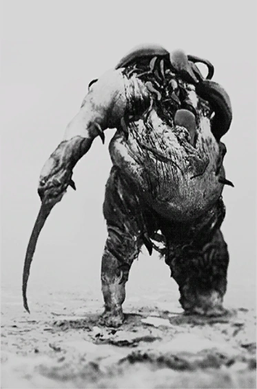 丸まった枯れ木の様な固い外皮装甲に覆われた膨れた異形。