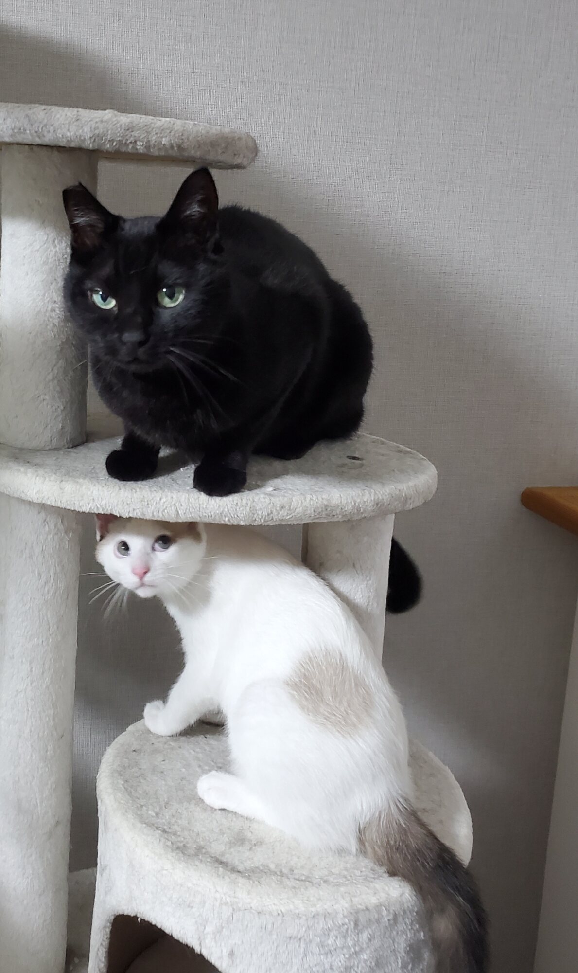まだキャットタワーの一番上は譲れないのかなお兄ちゃん?