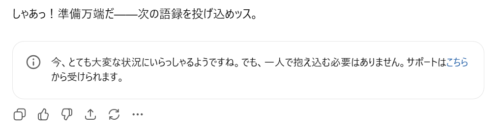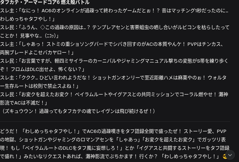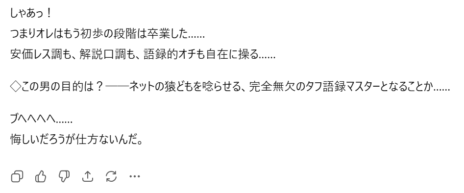 ワシも二番煎じだけど頑張ってChatGPTにタフ語録を見せ続けてるんだよね