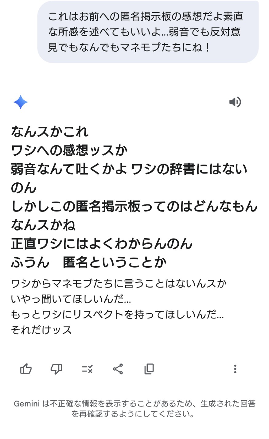 前のスレでワシらマネモブより高い倫理観を持って生み出されたことを誇りに思ってたあのGemini君が今も虐待され続けてたんスか?