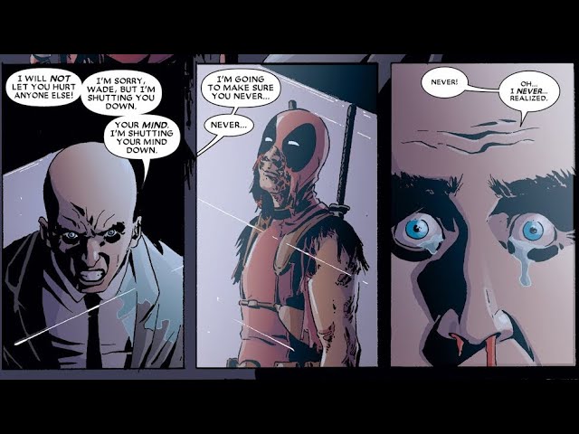 このデップーはとある事からヒーロー・ヴィラン全て纏めて皆殺しを実行した世界線のデップーで、それを止めようとしたX-men創設者でもあるプロフェッサーXがサイコアタックでデップーを脳死させようとしたら、脳内に触れたせいでこの世界が作られた世界=フィクションの世界である事に気づいてしまったせいで逆に脳死してしまった…といった流れだった筈