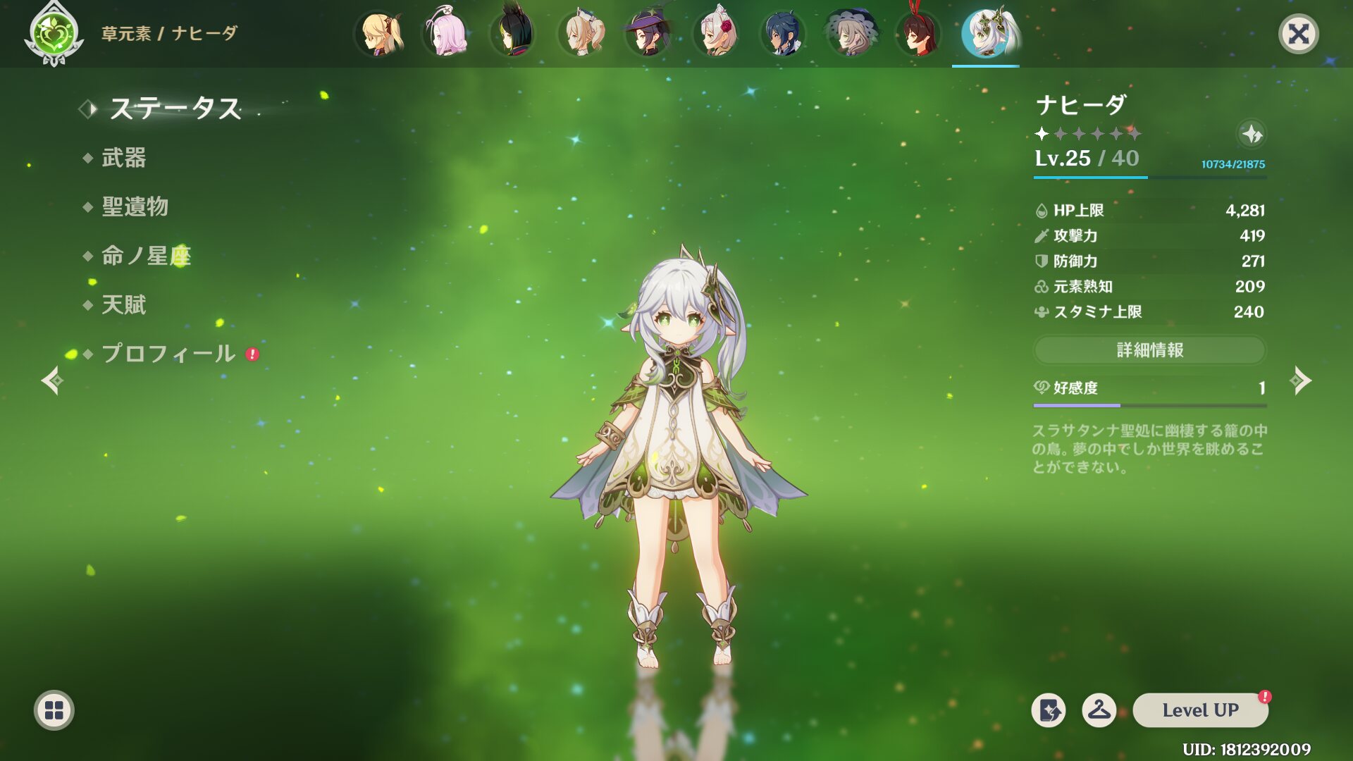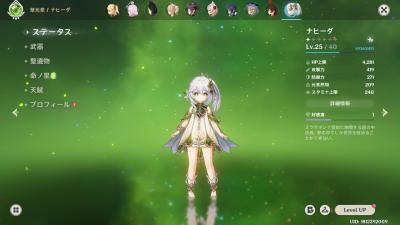 聖遺物は最低限、月を紡ぐ夜の歌4つと適当な1つでメインを元素熟知で揃えたから後はレベル上げ