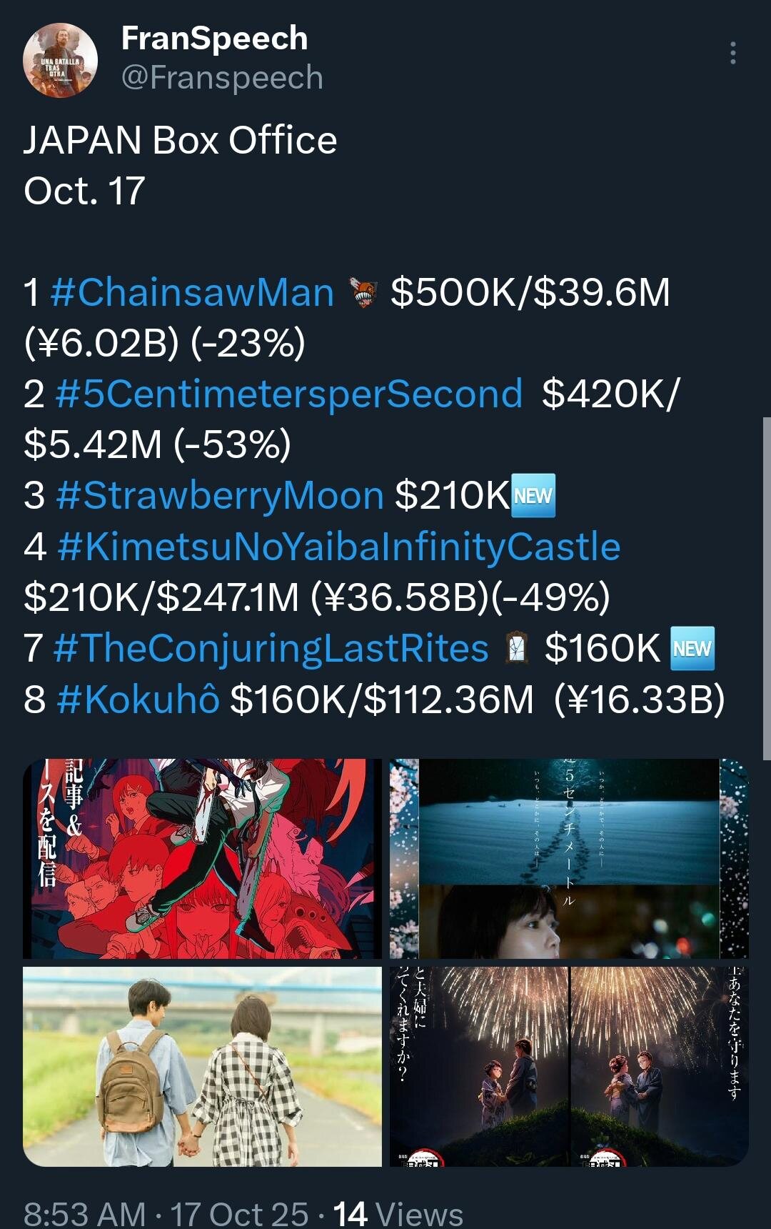最近ヤフーニュースにもなってるし配給会社には100億にしようという流れもきてる - 161二次元好きの匿名さん25/10/16(木) 13:20:54