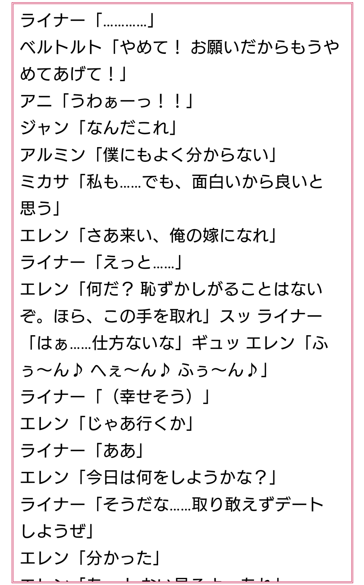 ただ流石にレイプとかまで行くと困惑が来るしエレン自身も苦しむんじゃないかとかも考えたりして「やめろ」「何故こんなことを」とか色々言うけど何言っても無駄だと察したらもう何も言わずに黙って受け入れるしかないよね美しいね