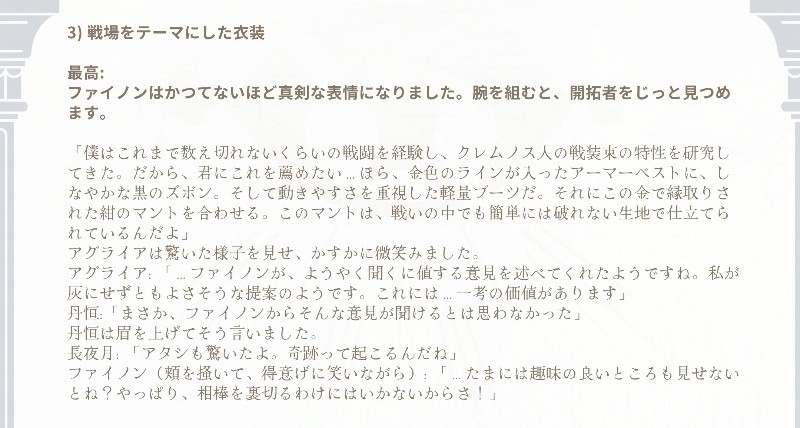 ファイノンの香水が柑橘系の爽やかな香りから藤と桃の花の香りを経てムスクの香りに変わるの、こう……無邪気な少年が恋を知って大人になるみたいなイメージを感じていいな