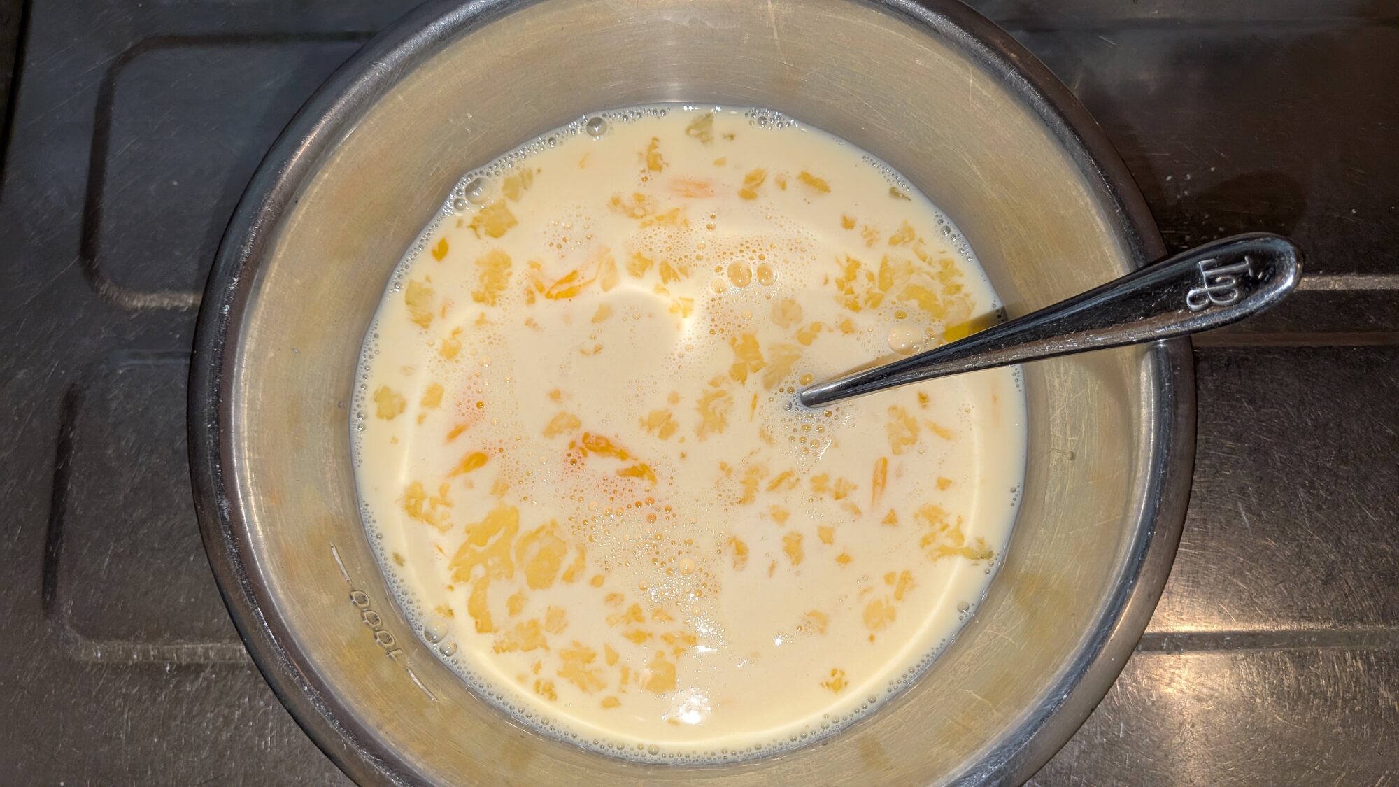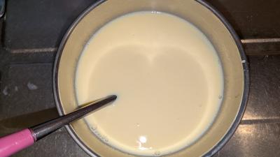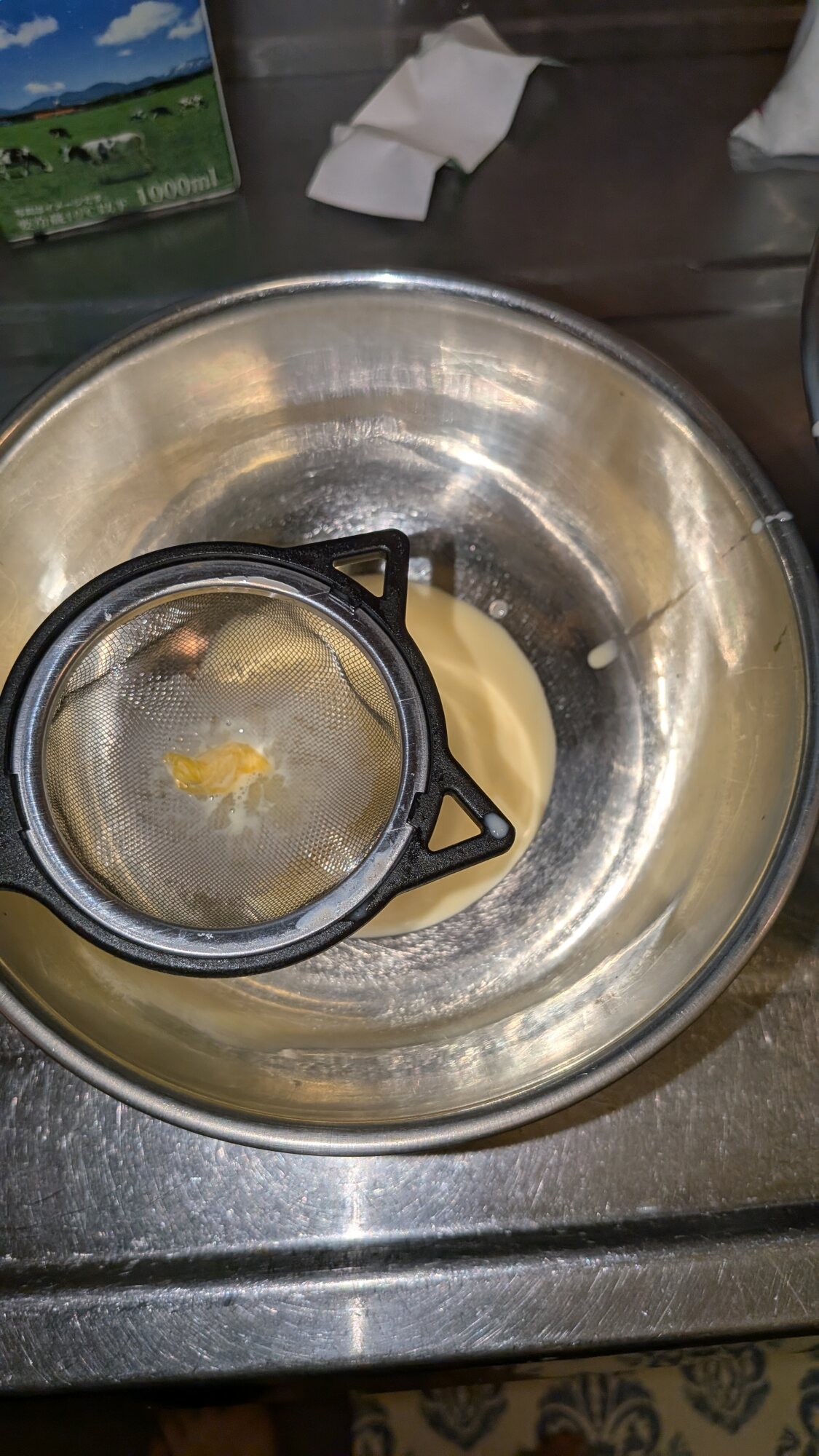 次に茶こしでプリン液を濾しますわ