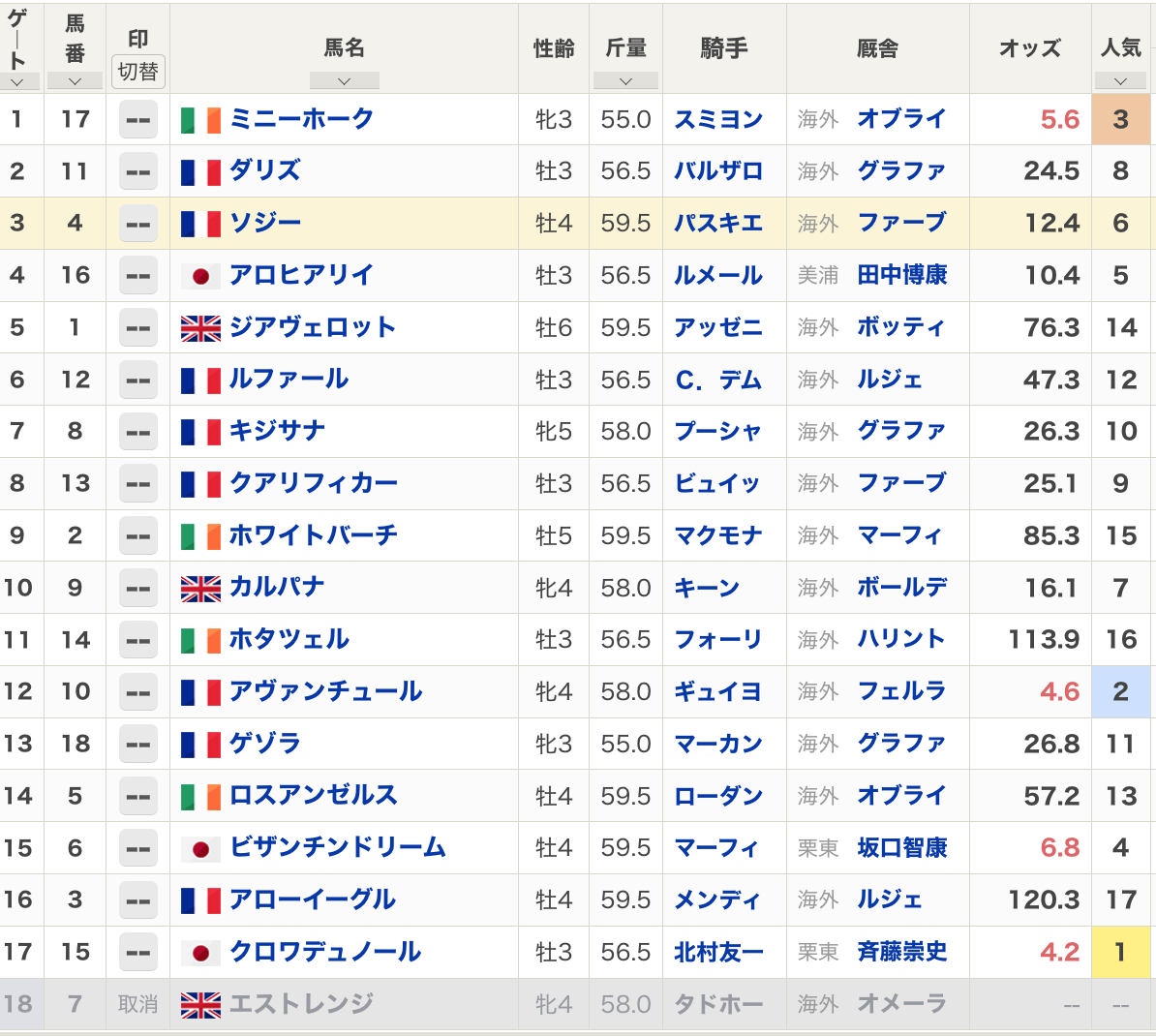 5-8が馬番の5-8でもゲート番の5-8でも現時点では荒れ馬券になるかな…(海外は馬番とゲート番が同じとは限らない)