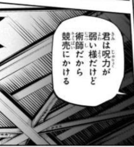呪力操作ができない=呪力で肉体強化ができない、だから覚醒前の真希は「一般人並の呪力を強いフィジカルでどう補うか」という選択肢しかなかった(この時点では扇の罵倒「我々術師は日々鍛錬した肉体を更に呪力で強化して戦う 真希 オマエの力など皆手抜かりなく持っているのだ」に反論の余地がないのが悔しいところ)