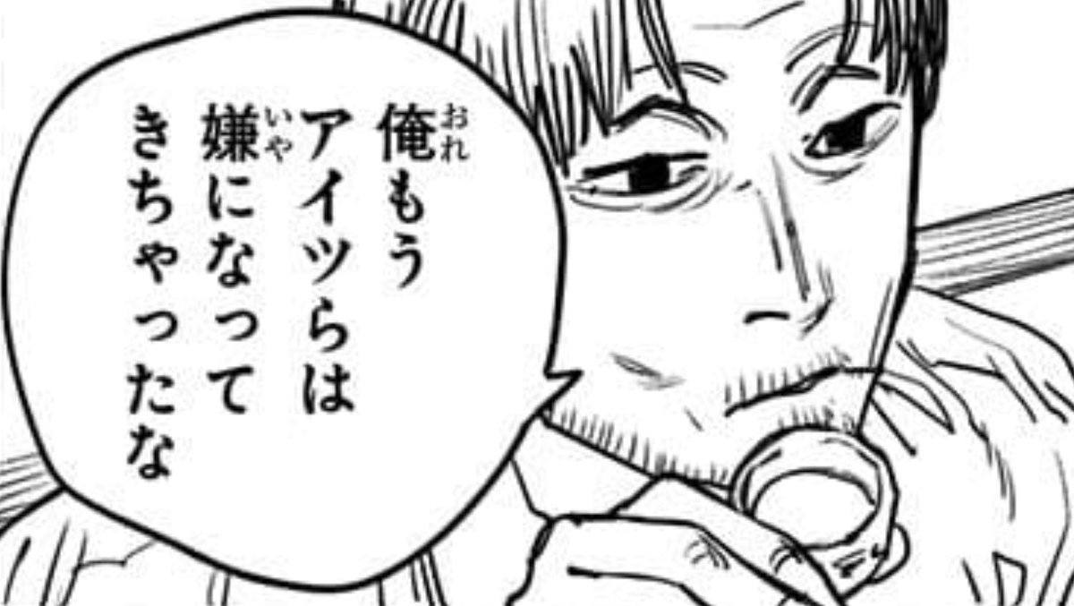 初めてデンジとパワーに抱きしめられた岸辺隊長バレないようにしてるけど目を見開いて涙ぐんでそう
