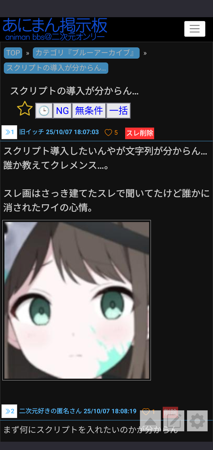 スクリプトの導入が分からん…|あにまん掲示板スクリプト導入したいんやが文字列が分からん…誰か教えてクレメンス…。スレ画はさっき建てたスレで聞いてたけど誰かに消されたワイの心情。bbs.animanch.com - 53二次元好きの匿名さん25/10/09(木) 13:11:02