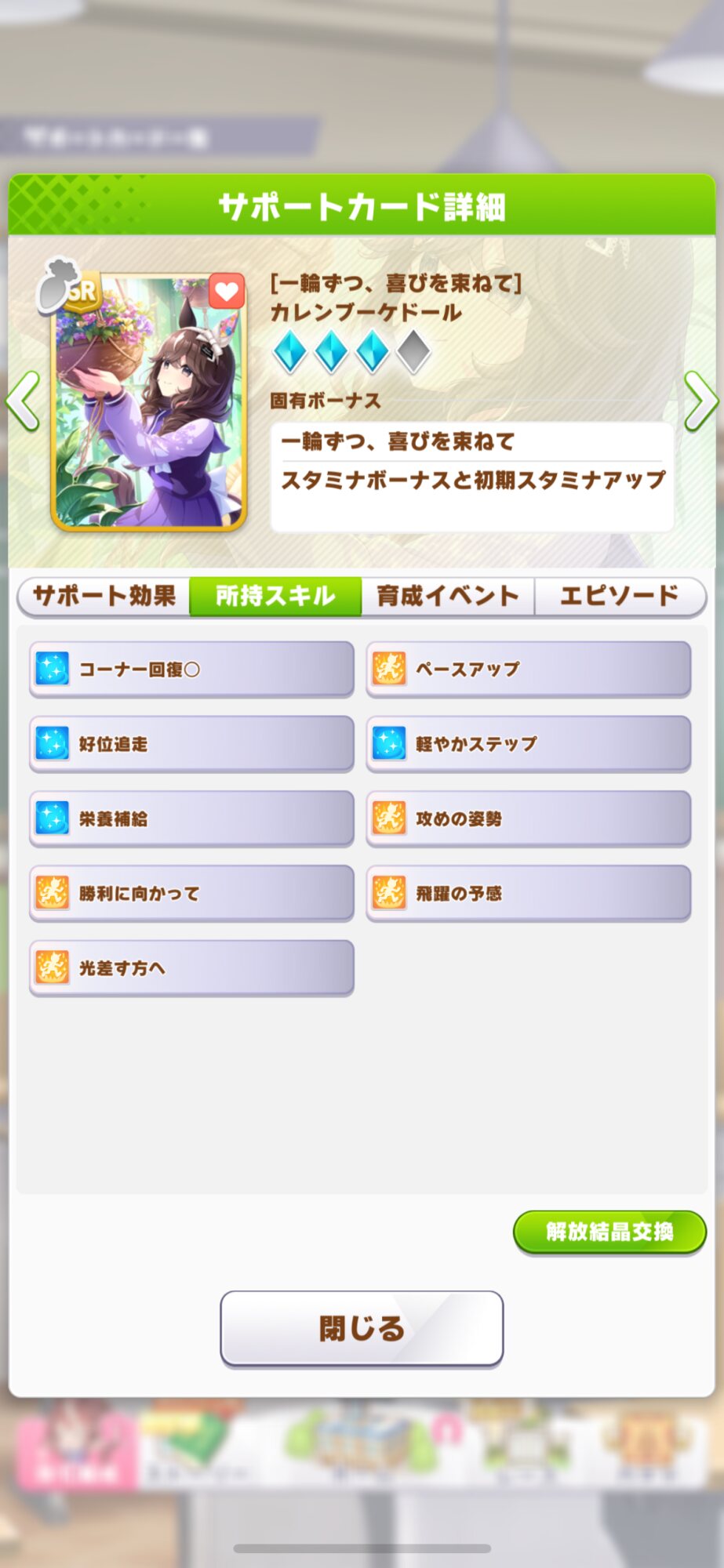 頭アルミホイルの考えだが個人的に怖いのが今ステカンストが多いからスキル数で差を付ける時に、長距離レースで直線回復に落としてマエストロ採用とかなったら怖いんだよね