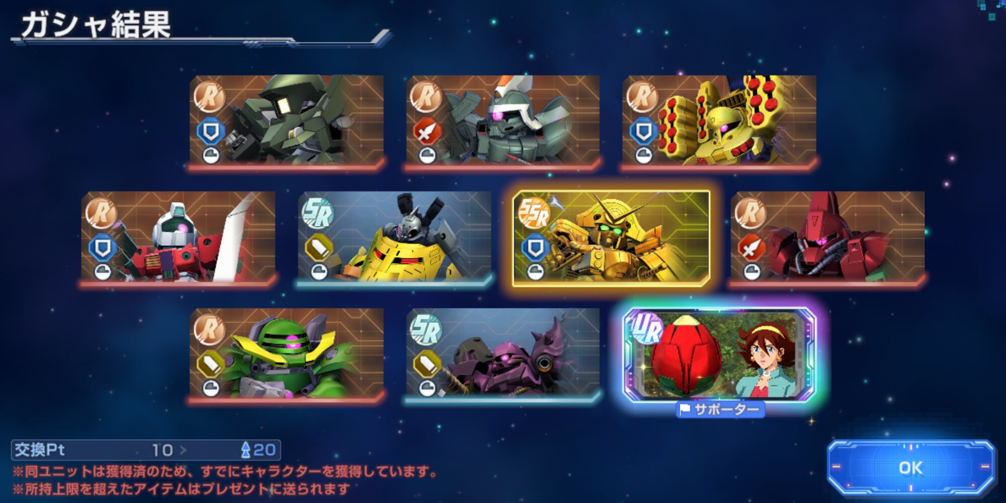 最低保証食らった挙げ句唯一のSSRはサポーターギレンだったんだァ