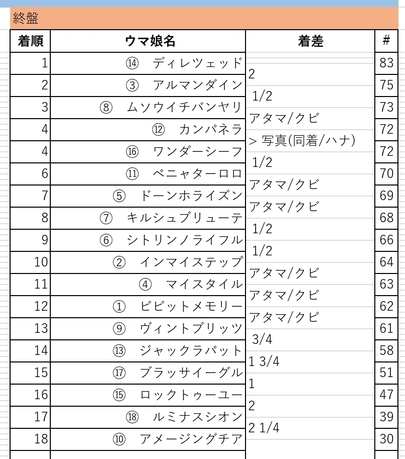 前有利の展開は終盤になっても変わらず、位置を上げていたアルマンダインが末脚を発揮し突っ込むも最終直線で二の足を爆発させたディレツェッドが競り合いを制し逃げ切り、見事朝日杯以来の待望のGⅠ勝利を飾った。
