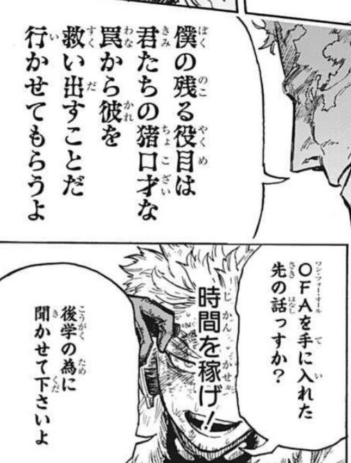 ビームで一気に若返ったのゾーーッとした。あれは発光でビームを中和していたのかな?あと30秒抑え込まれていたら、AFO、雄英まで辿り着けもしなかったんでは……