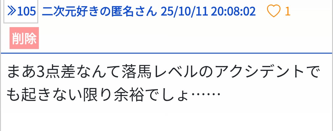 相手コーチ「気を抜くなよ…ガチで気を抜いた時が一番危険だ」 - 22二次元好きの匿名さん25/10/11(土) 20:46:08