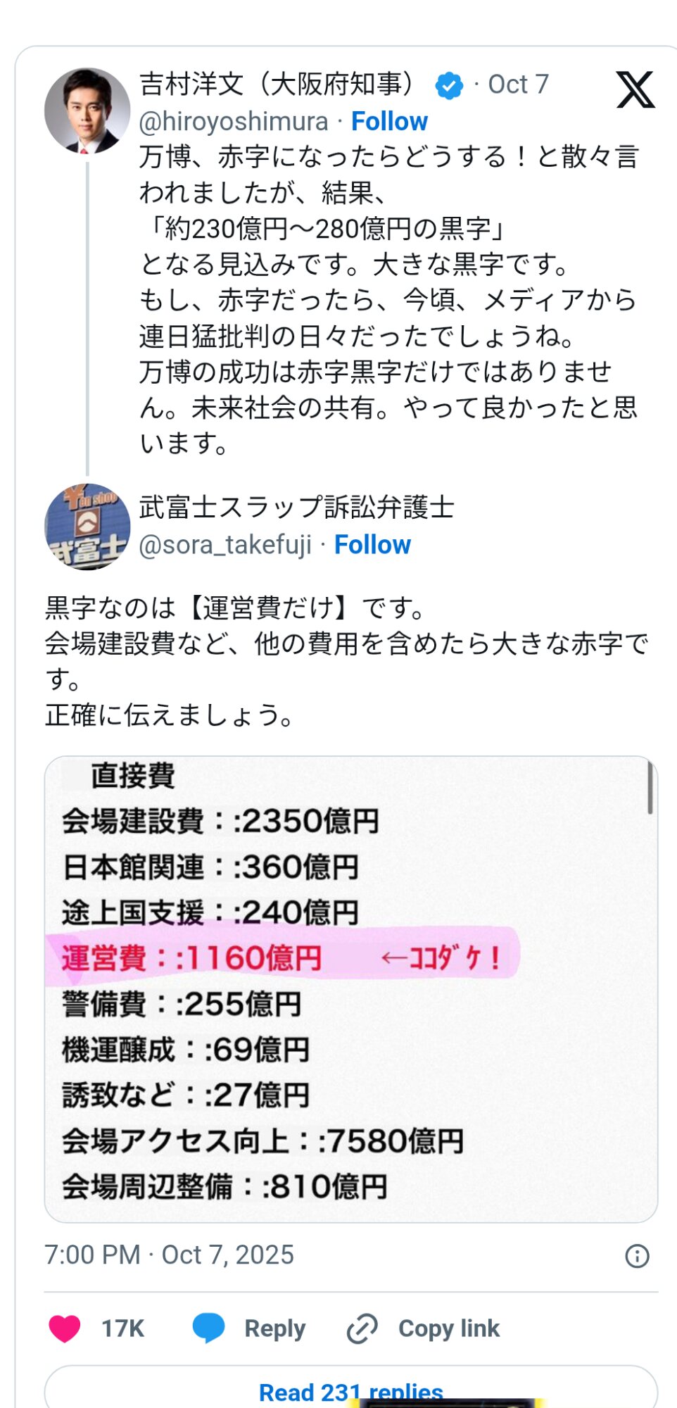 それが実際には200億円くらい黒字になってよかったねってニュースであって元々前提にいれてない建設費と警備費のこと言い出しても仕方ないんだ - 56二次元好きの匿名さん25/10/12(日) 13:31:21