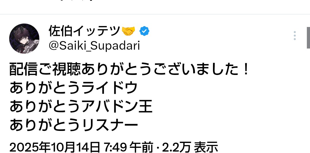 よくよく考えてみれば新PCからの雑談合わせればほぼ半日配信してたんだな - 22二次元好きの匿名さん25/10/13(月) 03:01:47