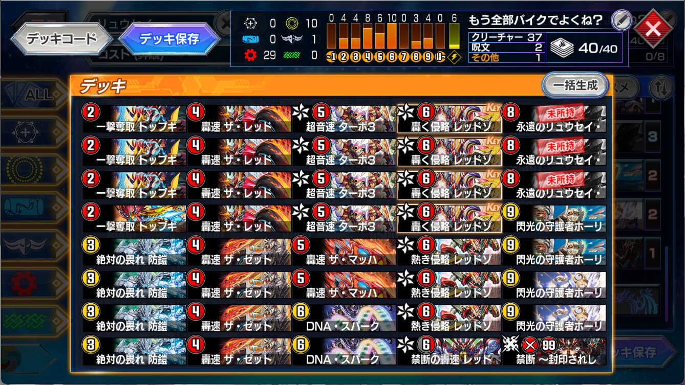 白10は不安なのでリュウセイ×1レッゾZ×1抜いてオリオかな。もしくはリュウセイ抜かずマッハ×1抜くか