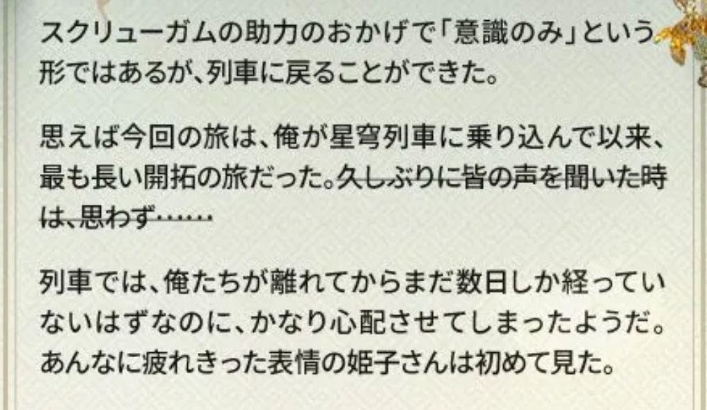 エーグル戦あたりまで早く列車に合流したくて、天外に連絡を取れるまでのゴールが引き伸ばされてく感覚が長かったな