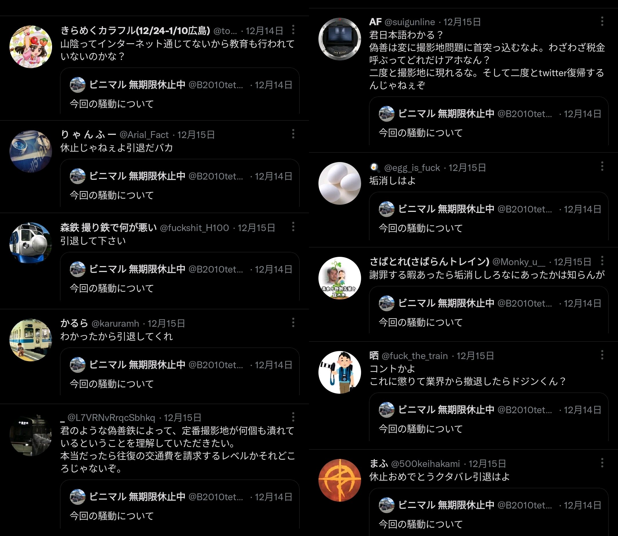 この動画がネット上に拡散された際は「捏造動画」と一貫してこれは撮り鉄ではないと主張した。