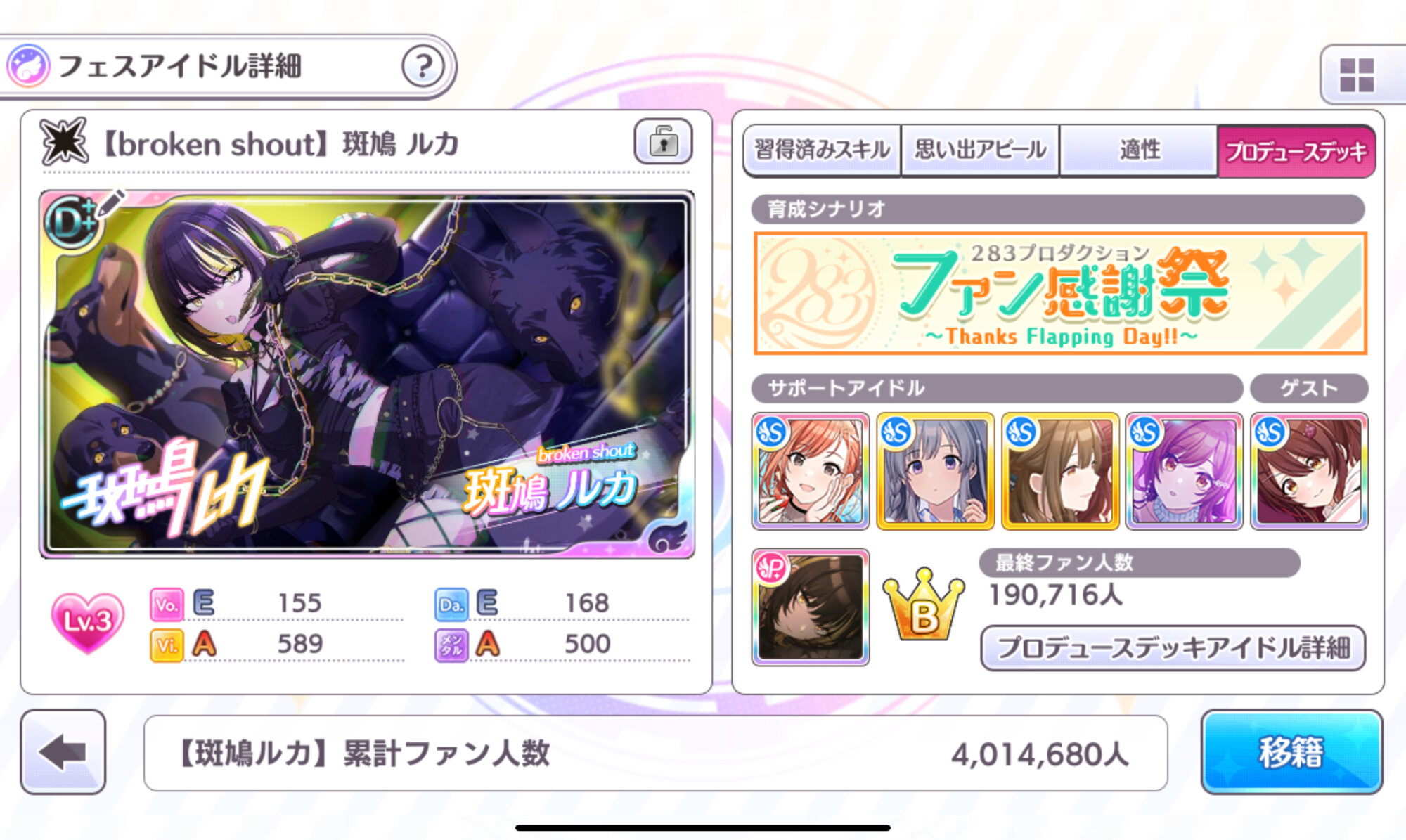 あとファン数50万人難しすぎる…420000くらいで止まってしまう……オーディションたくさん出てるんだけど…