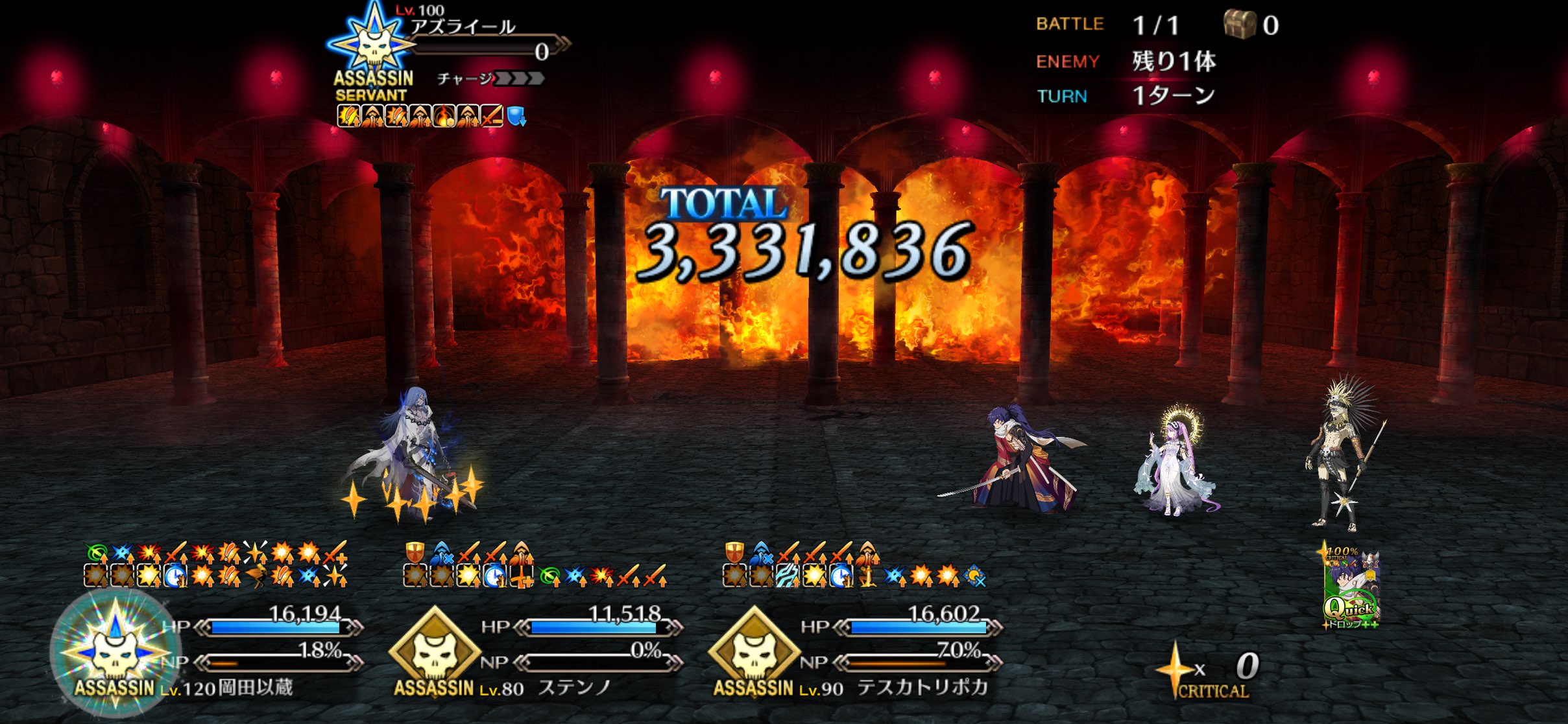 サンソンの即死がおかしいくらいに効く。即死前のダメージだけでも結構いく。マタハリ、光コヤンありがとな