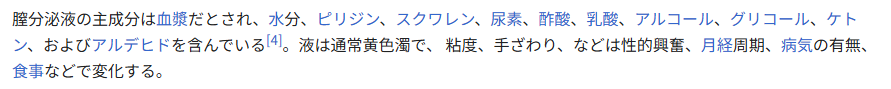 その結果Wikipediaの膣分泌液の項目で「ピリジンが含まれる」と書かれてた部分の参考文献は単なる海外のエロサイトだったし日本語のサイトもこれぐらいしか見つからなかった