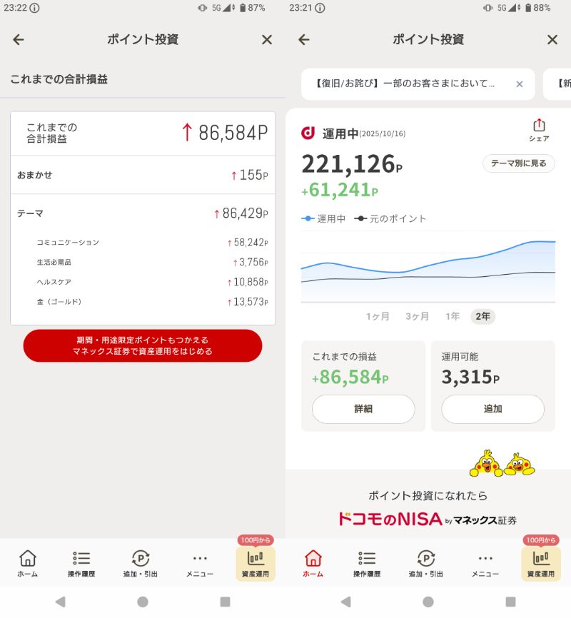 Dカードゴールド+ドコモ光+ドコモ回線が10年位あってそれで年12000ポイント+決済ポイントを全部投資に注ぎ込んだ結果
