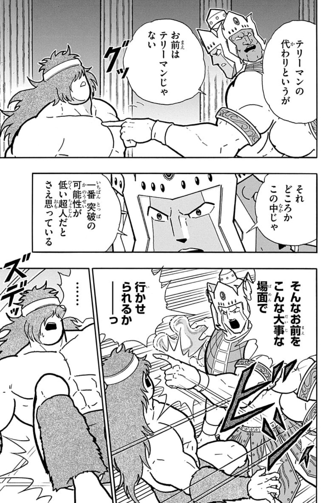なんかそう考えると「だまらんか――スグル!」のくだりも落ち着きある年長者として弟を一括したと言うよりは、自分もチームが苦戦して余裕がない状況で下からスグルにやいのやいの言われて思わず“キン肉マンソルジャー”としての演技を忘れて素で大声を張り上げてしまったみたいでリラックス出来ますね