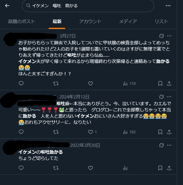 イケメンの嘔吐助かるはガチの特殊性癖で本当に助かってたか、何とかして肯定的な感想を書こうとしての苦し紛れかだと思うけどな