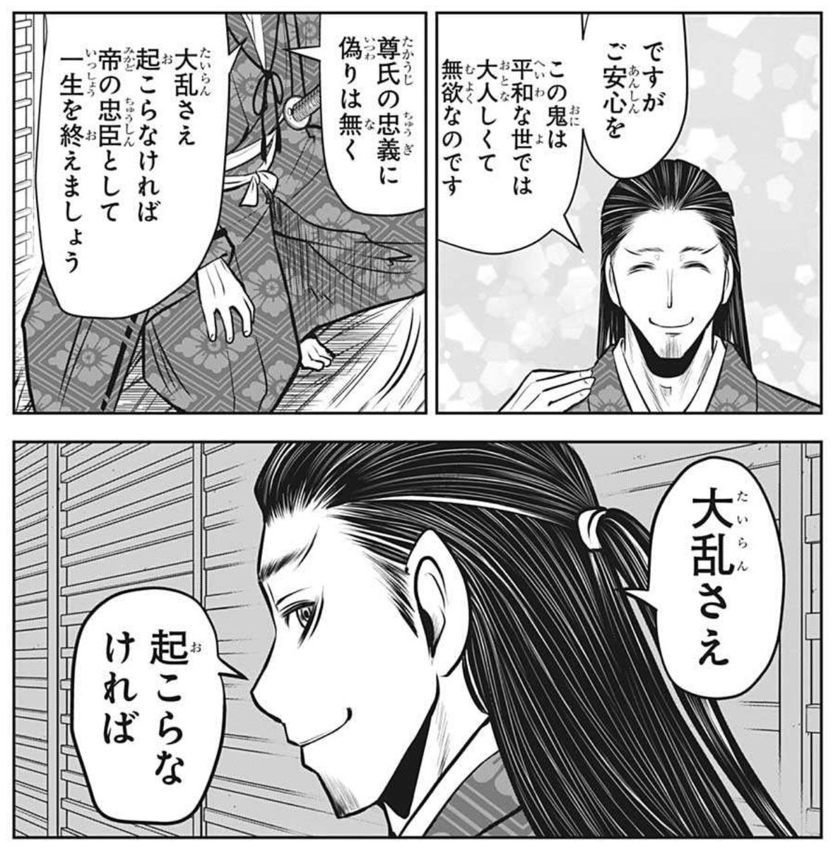 画面の外に話しかけるって手法はアンテとかで見たことあるけどこれを歴史漫画で見るとは思わなかった、そして尊氏の迫力と背中のキショさが半端ない