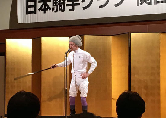 仕掛けで割れやすくしてあるガラス瓶で後輩騎手の頭ぶん殴って放送コードに引っ掛かるフランス語吐き捨てて部屋から出ていくドッキリ