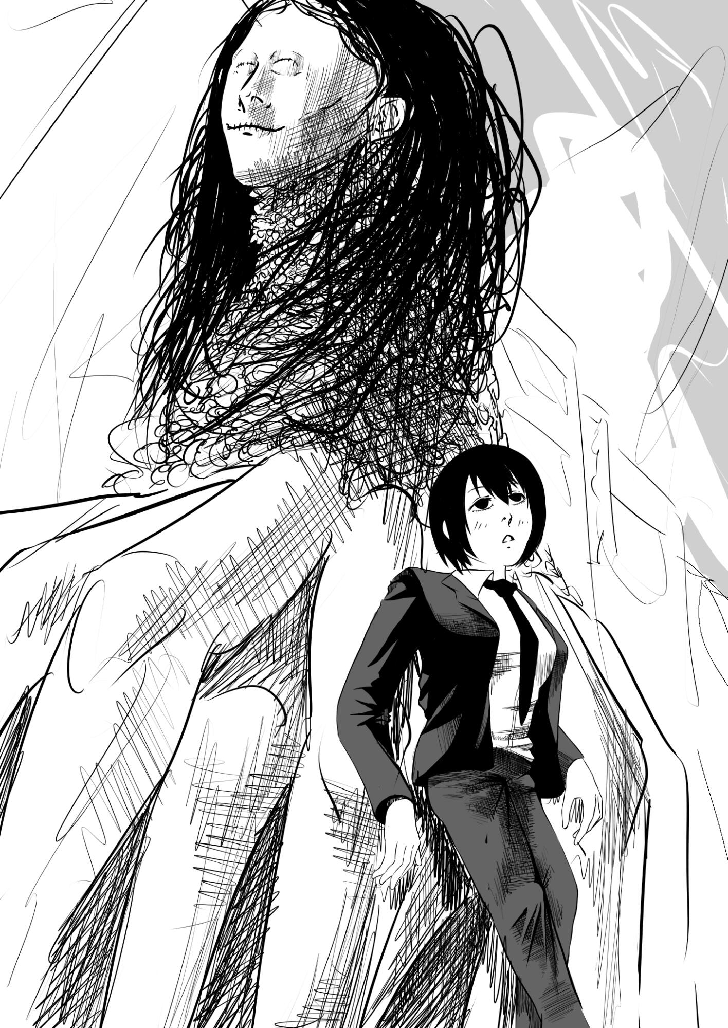 白目の目立つ蝋人形みたいな表情、くしゃくしゃと描き込んで毛先がチリついて痛んでいるように見える髪の毛、無数の足のどっしりした感じと、個性的で魅力を感じます