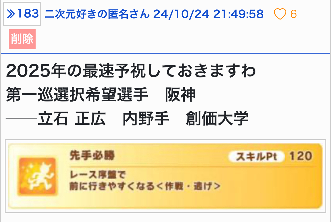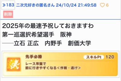 何かしらそこの球団に関係があるか、本当の推しウマ娘ならいいとは思いますが…。 - 18二次元好きの匿名さん25/10/23(木) 08:53:26