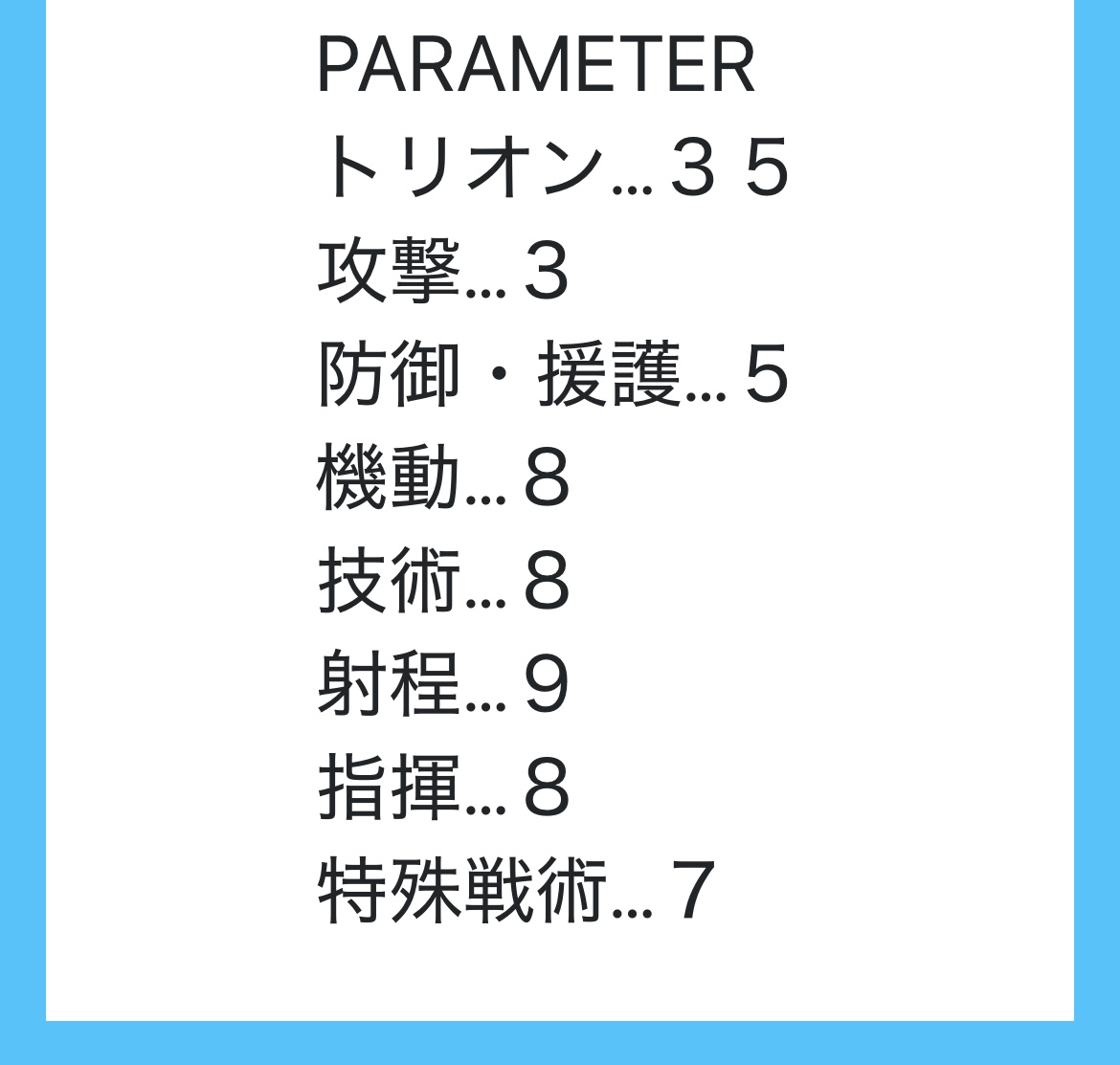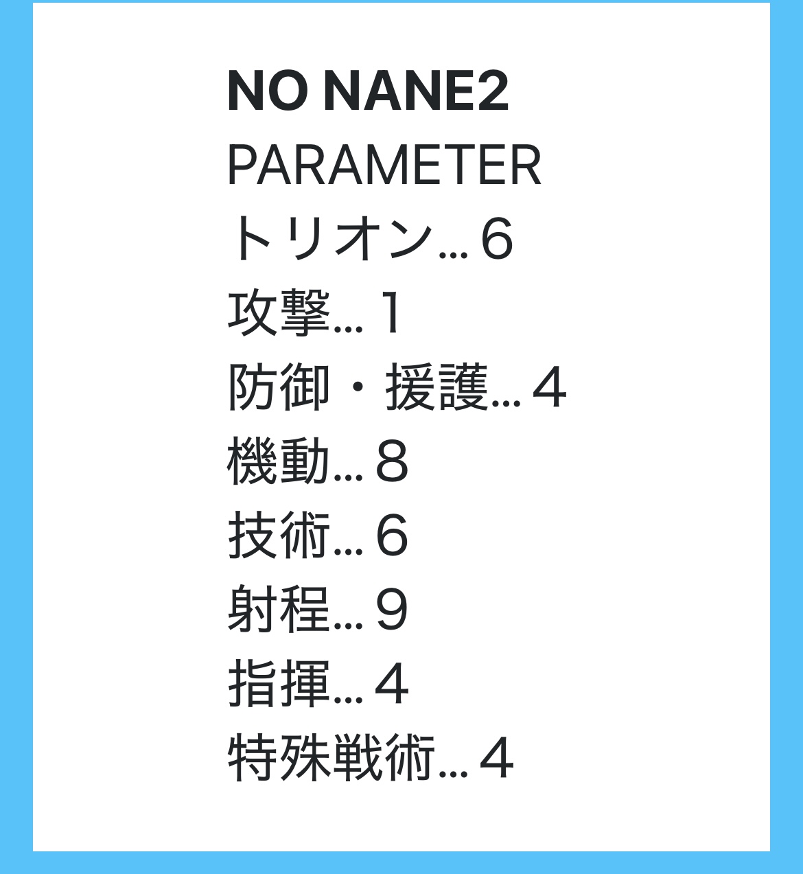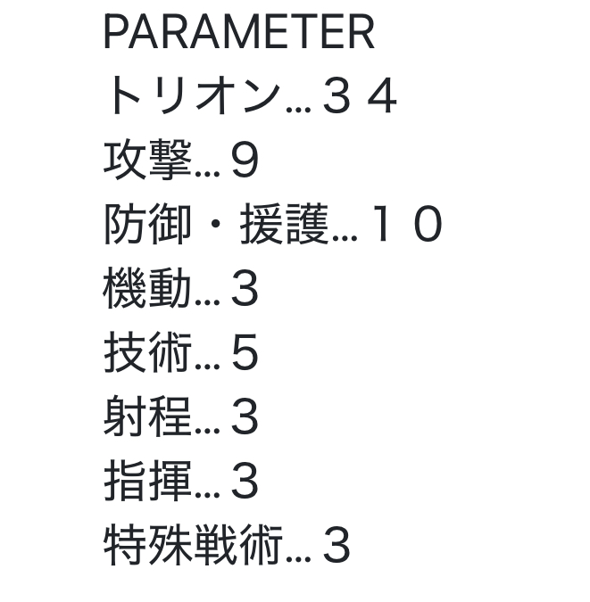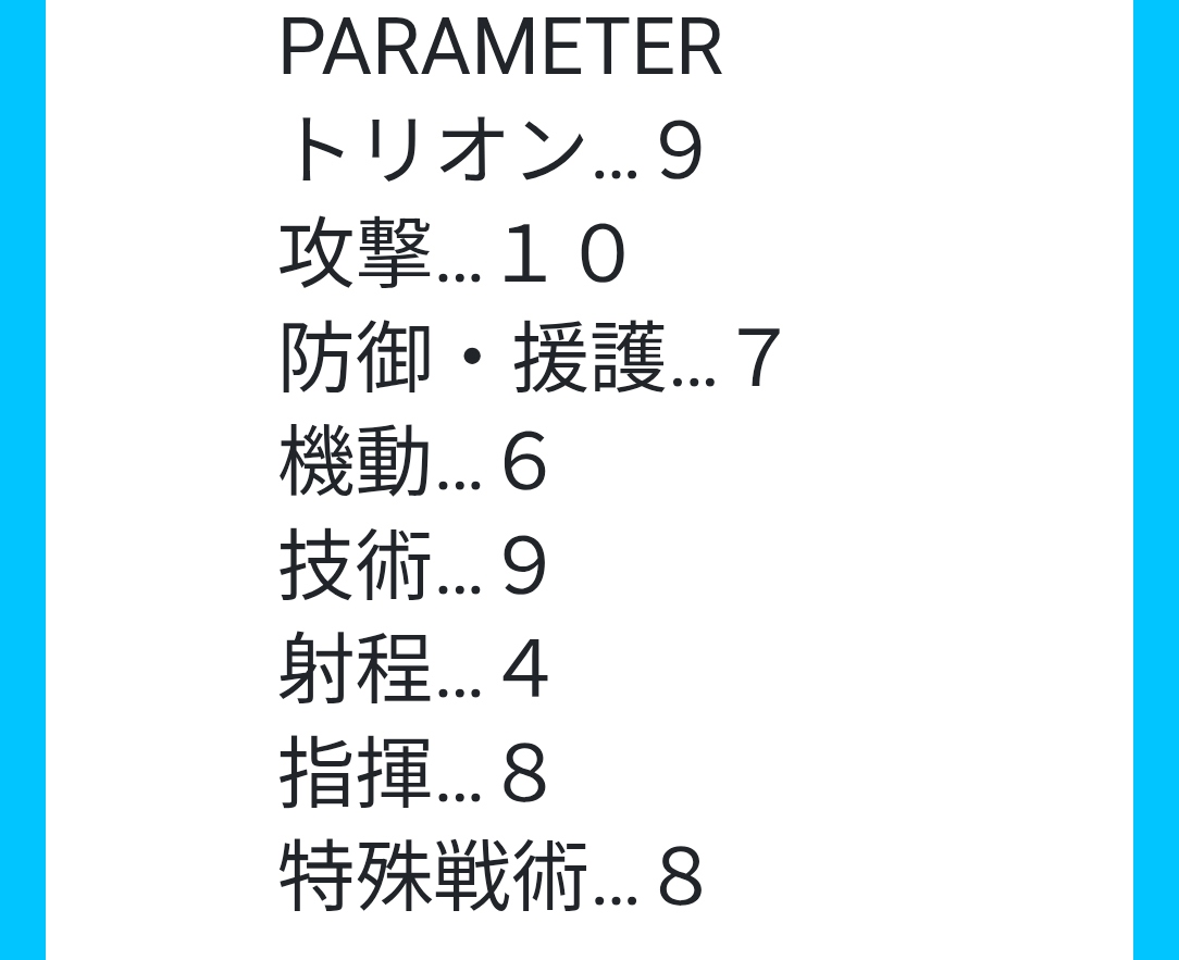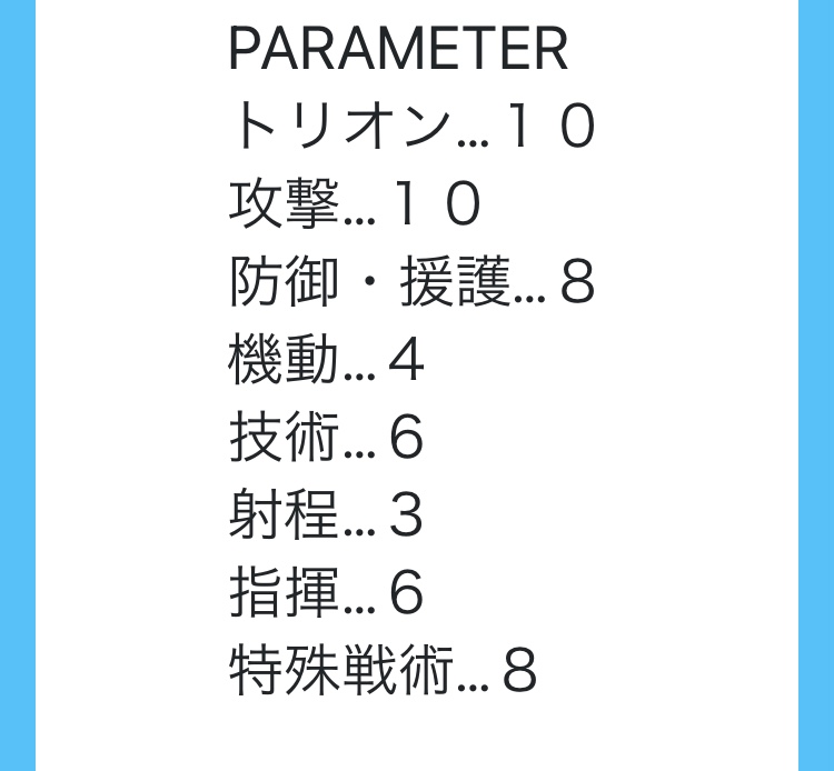 ト6 攻9 防7 機7 技8 射3 指9 特6 合計55