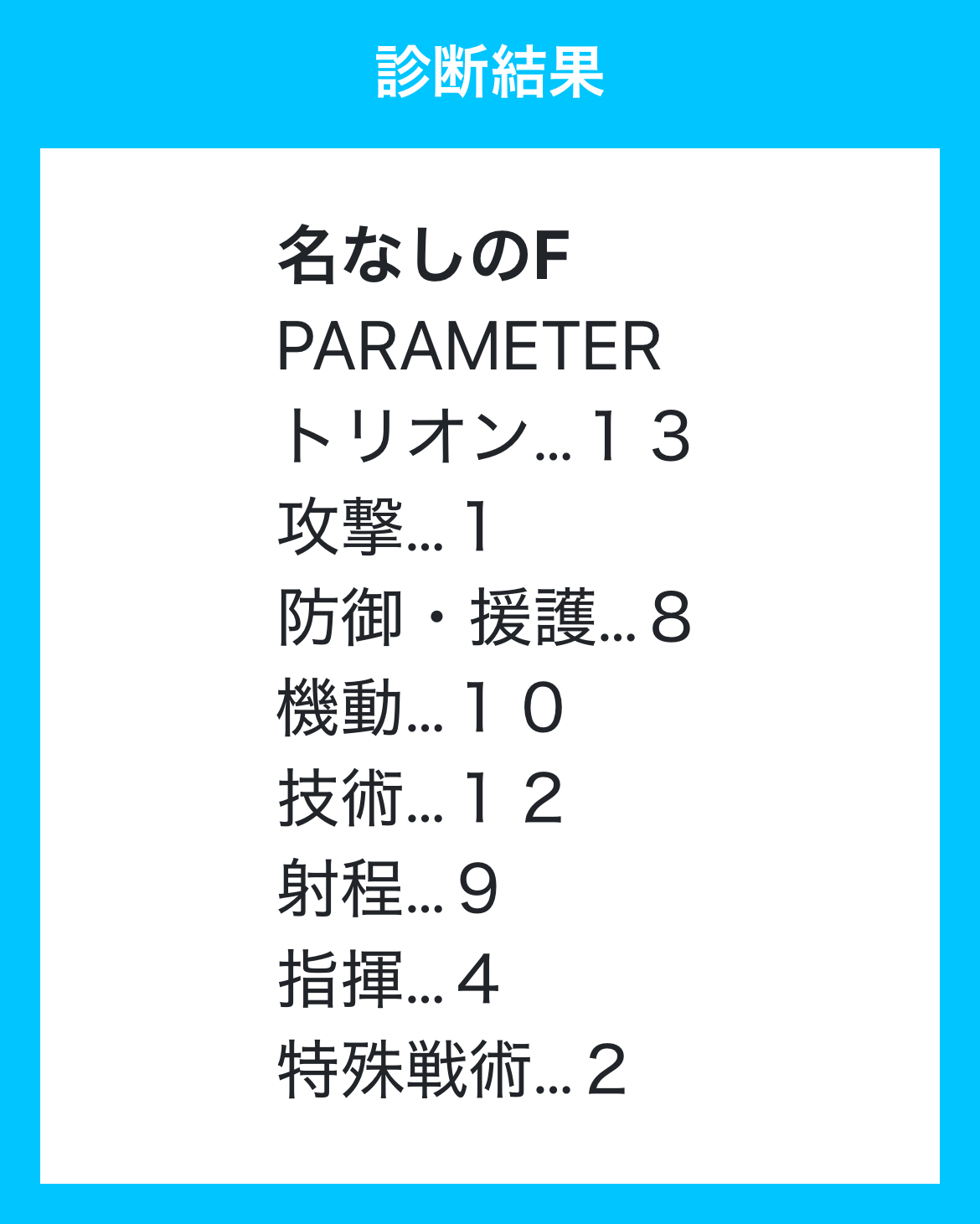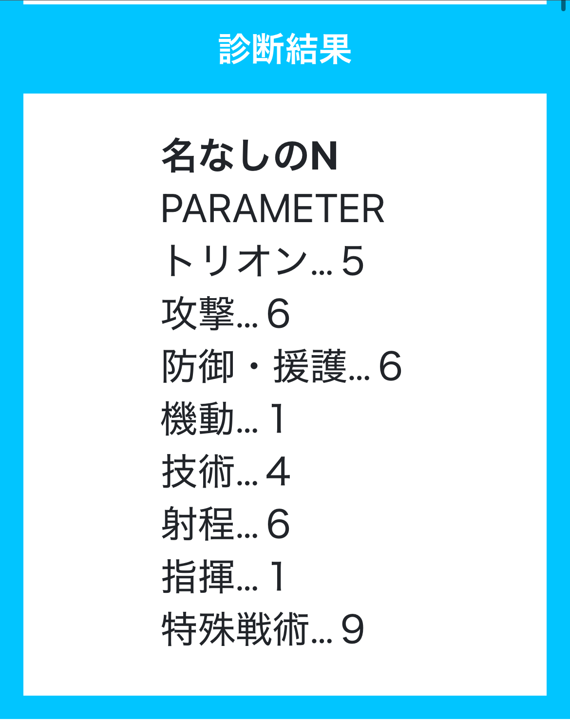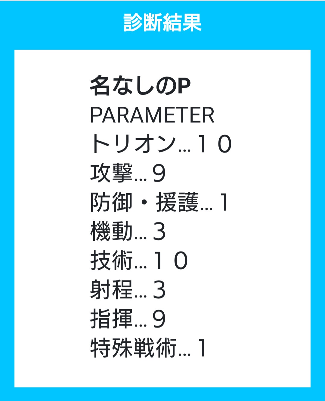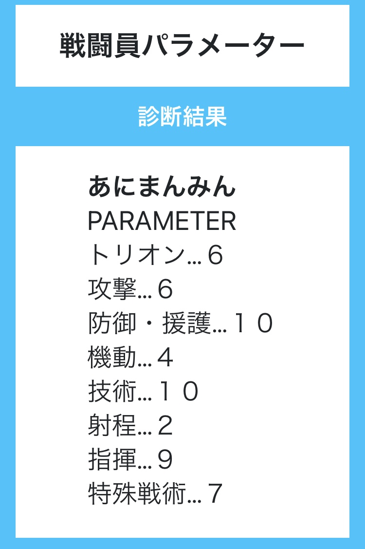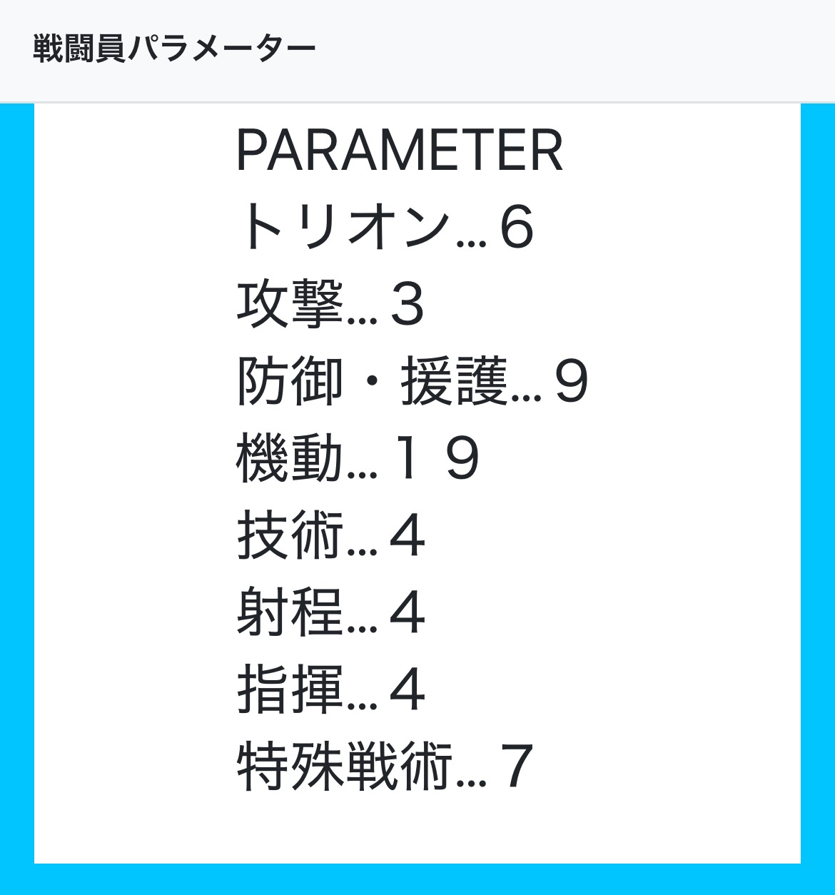 ト6 攻9 防7 機7 技8 射3 指9 特6 合計55
