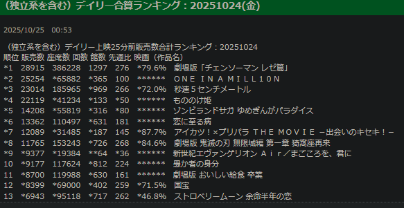 上映館が県に1、2館しかない地方住みのマネモブは早く見に行けよ多分すぐに1日の上映回数1回になるからな