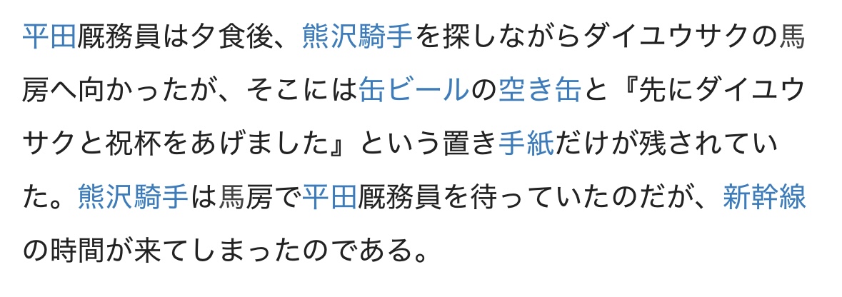 当時付き合ってた彼女に馬と私どっちが大事って聞かれて迷わず馬って答えたし、ダイユウサクを担当できたことは競馬人生で俺の誇りって言ってたし、大切にしてんやな - 131二次元好きの匿名さん25/10/27(月) 18:00:07