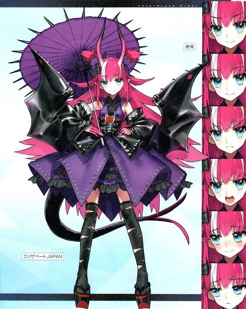 『エリザベートJAPAN(FGO)《性別:女性 一人称:私 性格:高飛車で好奇心旺盛。アイドルに憧れている。 特徴:ミニ着物を基調としながらも、竜の翼を覆うジャケットと一体化した振袖風のデタッチド・スリーブや帯風コルセット等、レザーとシルバーでキメッキメにカブいたロックでヴィジュアルなデザインの服装。額の左右からまっすぐに伸びるシンプルな角》』
