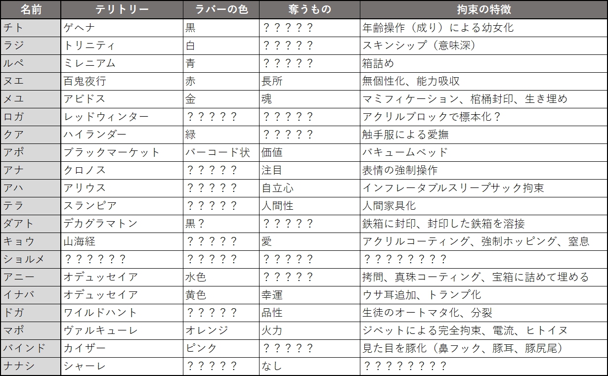 ラバーの色は茶色とかセピア系統で、奪うものは「知恵」とか(チェス駒にした対象の知識や記憶を垣間見れるようになる)