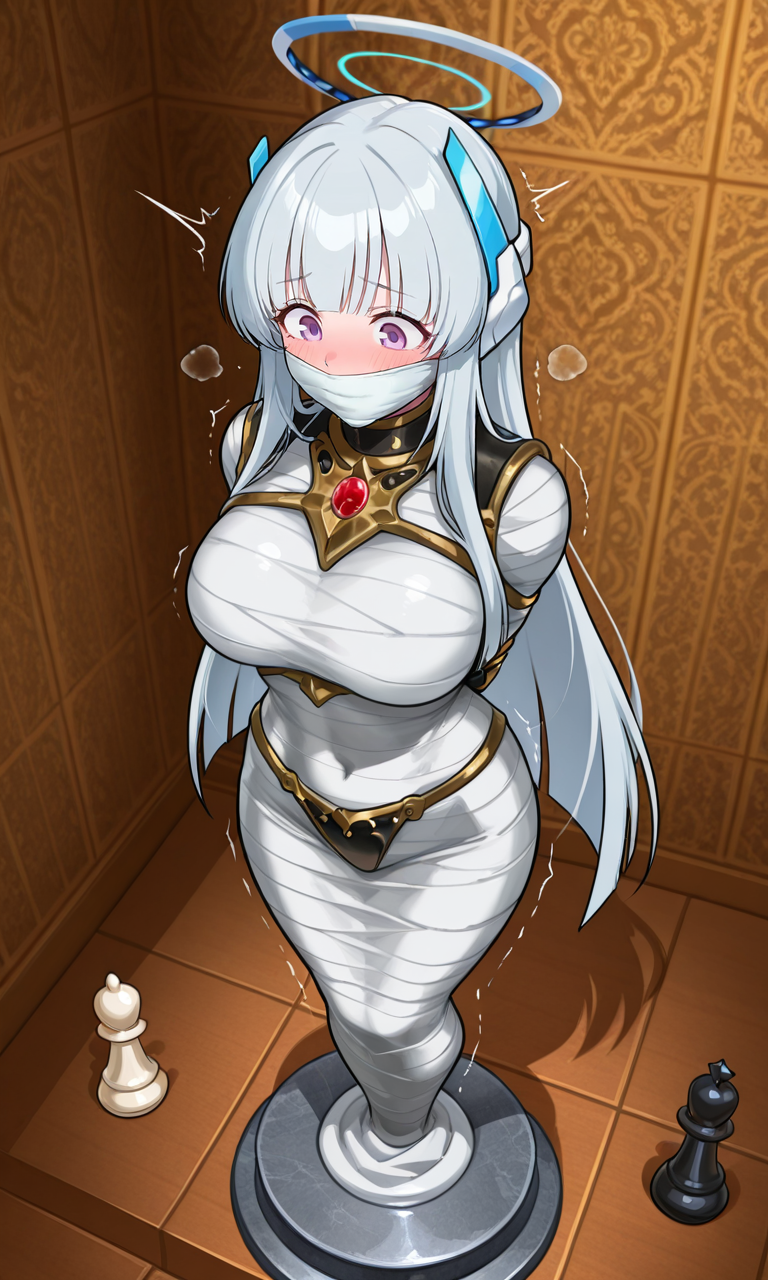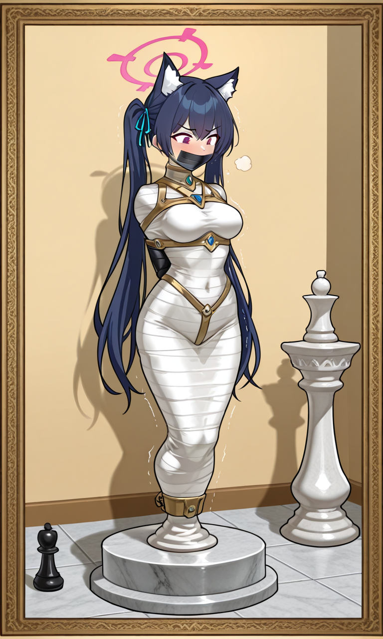 izuna (blue archive), fox tail, large breasts, latex bondage, fused leg,armless amputee,latex bodysuit,latex gag,gagged,mask,chessboard,chesses,((chess pedestal)),no feet,chessboard-patterned floor,chess bondage,alternate costume, mvmmy_p3d3st4l, mvmmy pedestal, gagged, tape gag, mummification \(bound\), framed breasts, arms behind back, pedestal, stationary restraints,armbinder, Eyes looking down