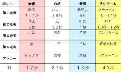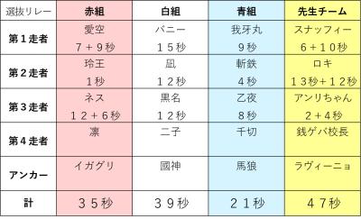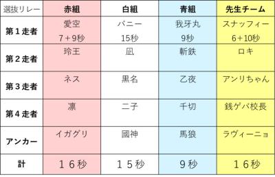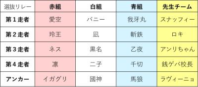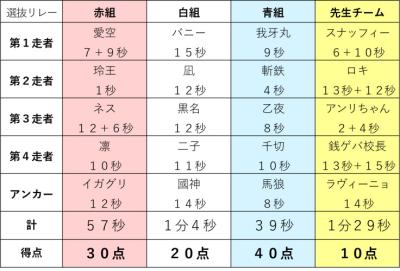 民「現在1位青組 2位赤組 3位白組 4位が先生チームです!」