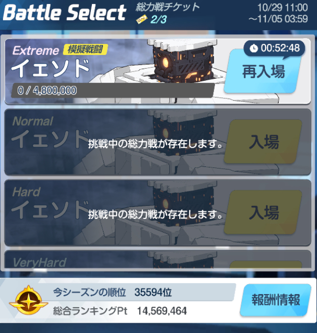 そのとおりなので、単に最終日までに目標難易度・目標トロフィーが取れれば良いのであれば、数日はある程度見に徹して(EXT・INSあたりで適当にチケットを消費しながら)、最終日にある程度固まった編成に向けて最低限育成を目指すほうが良いね