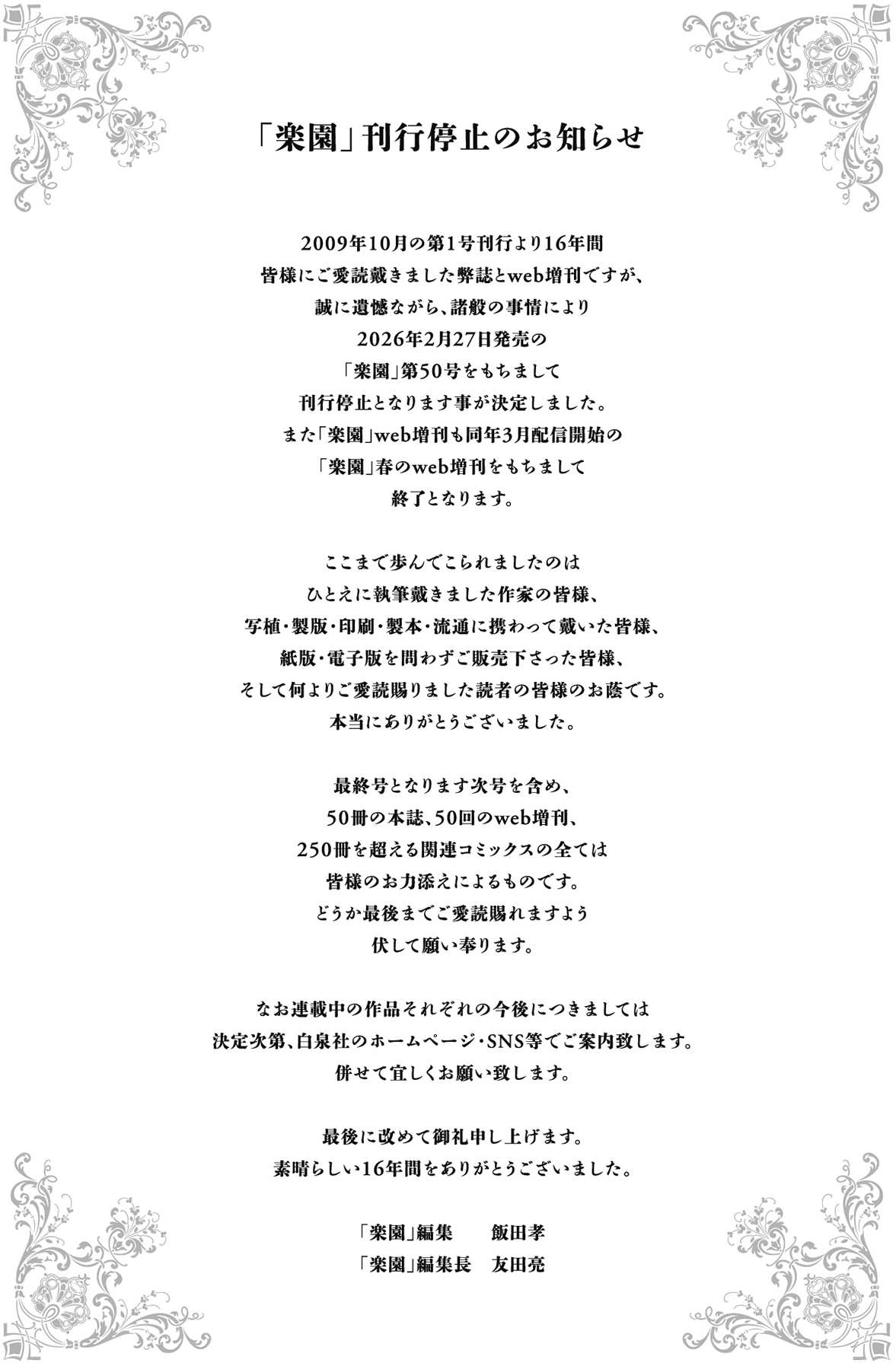 最後の刊行は2月末だからわりと早いお知らせだな