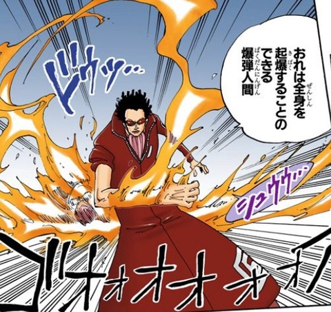 吐息が爆発するレベルだし、桶に入れた水に手を突っ込んで手に着いた水にも起爆能力が付くならガープの大砲の玉を投げる要領で手に持ったものを投げて即席の爆弾にするとかも出来るかもね。