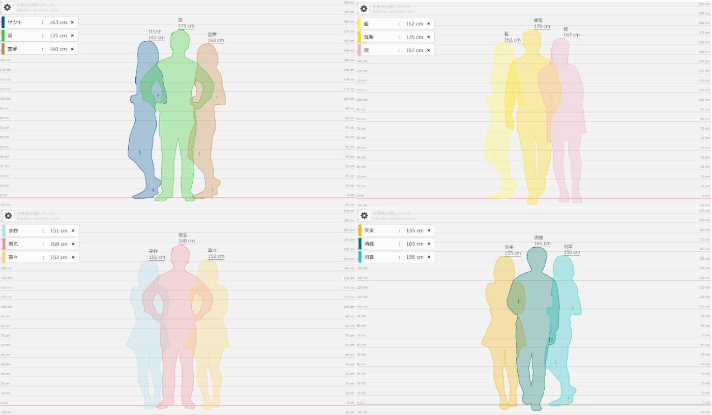 身長差は千切だと綺羅が12cm、彩葉が9cm、帝が7cm、はなが6cmで斬鉄だと綺羅が22cm、彩葉が19cm、帝が17cm、はなが16cmなんだよね